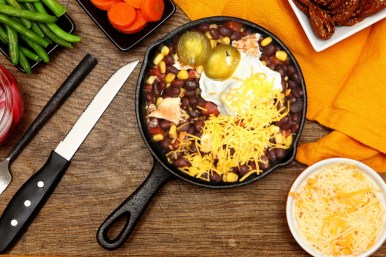 - Heat the oil in a large (12-inch) skillet over medium-high heat until shimmering hot. Reduce the heat to medium, add the onion, sprinkle with 1 tsp. salt, and cook, stirring, until softened and translucent, 4 to 6 minutes. Add the garlic and chili powder and cook, stirring, for 1 minute. Add half of the black beans, the chipotles and the adobo sauce, and 3/4 cup water and bring to a boil. Cook until the liquid reduces by about half, 2 to 3 minutes.