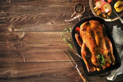 - Remove the duck’s wing tips, if necessary, and any giblets (save the parts for stock, if you like). Rinse the duck well inside and out, and trim any excess skin and fat. Season the duck well inside and out with salt and pepper. Stuff the cavity with the rosemary, orange, and onion. Tie the legs together with kitchen twine.